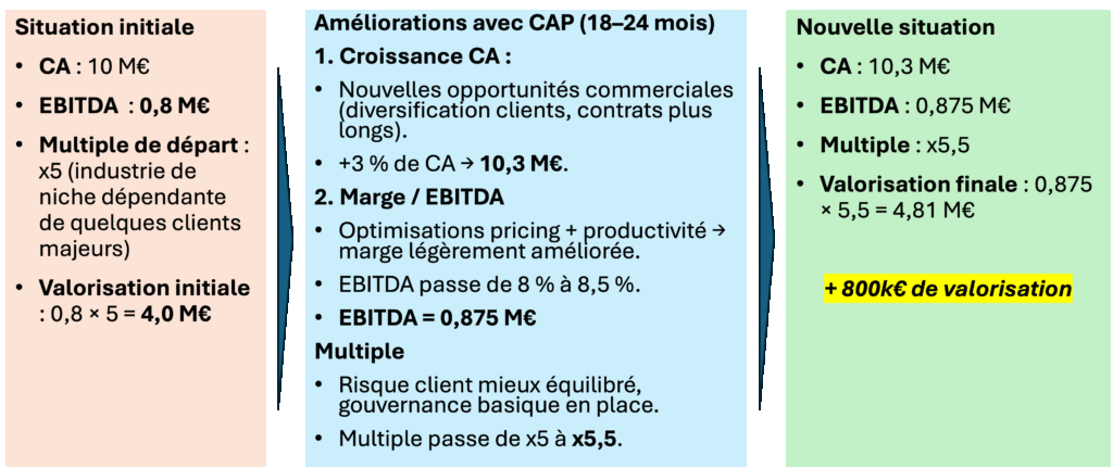 Voici un exemple d’impact concret d’un accompagnement CAP sur une PME industrielle : en 18 mois, la valorisation a progressé de +800K€, grâce à une meilleure diversification clients, une marge légèrement optimisée et une gouvernance renforcée